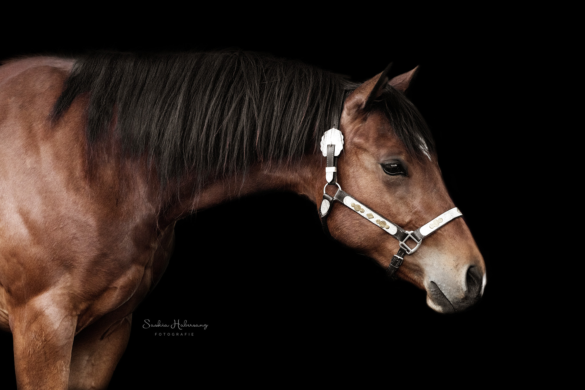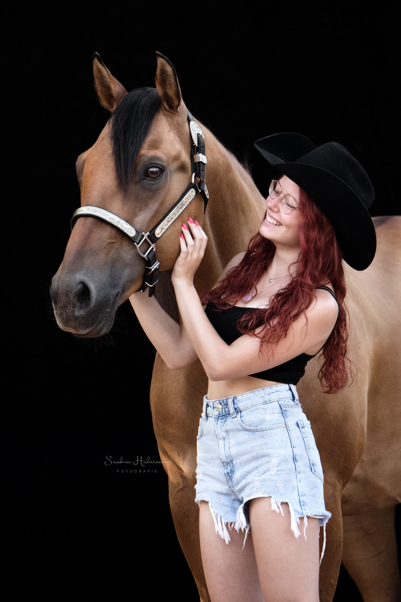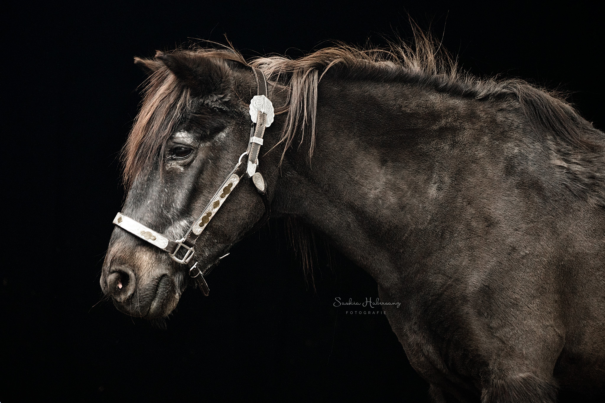 Die Pferde aus dem Stall von Westerntraining Maren Habich durften für ein Fotoshooting vor schwarzem Hintergrund posieren. Auch die beiden Reitbeteiligungen Nina und Viviana haben es sich nicht nehmen lassen und sich mit ihren Lieblingsreitschulpferden vor die Kamera getraut. Entstanden sind zeitlose, klassische Portraits.