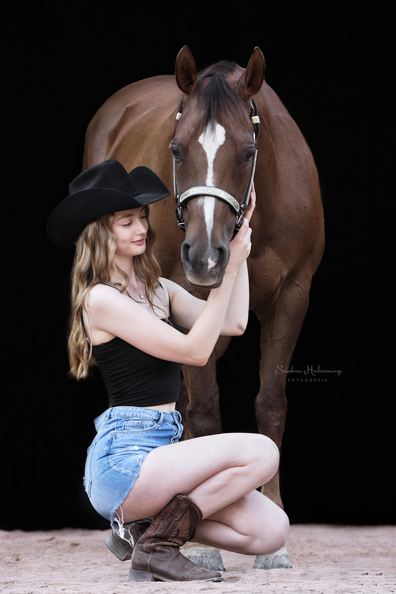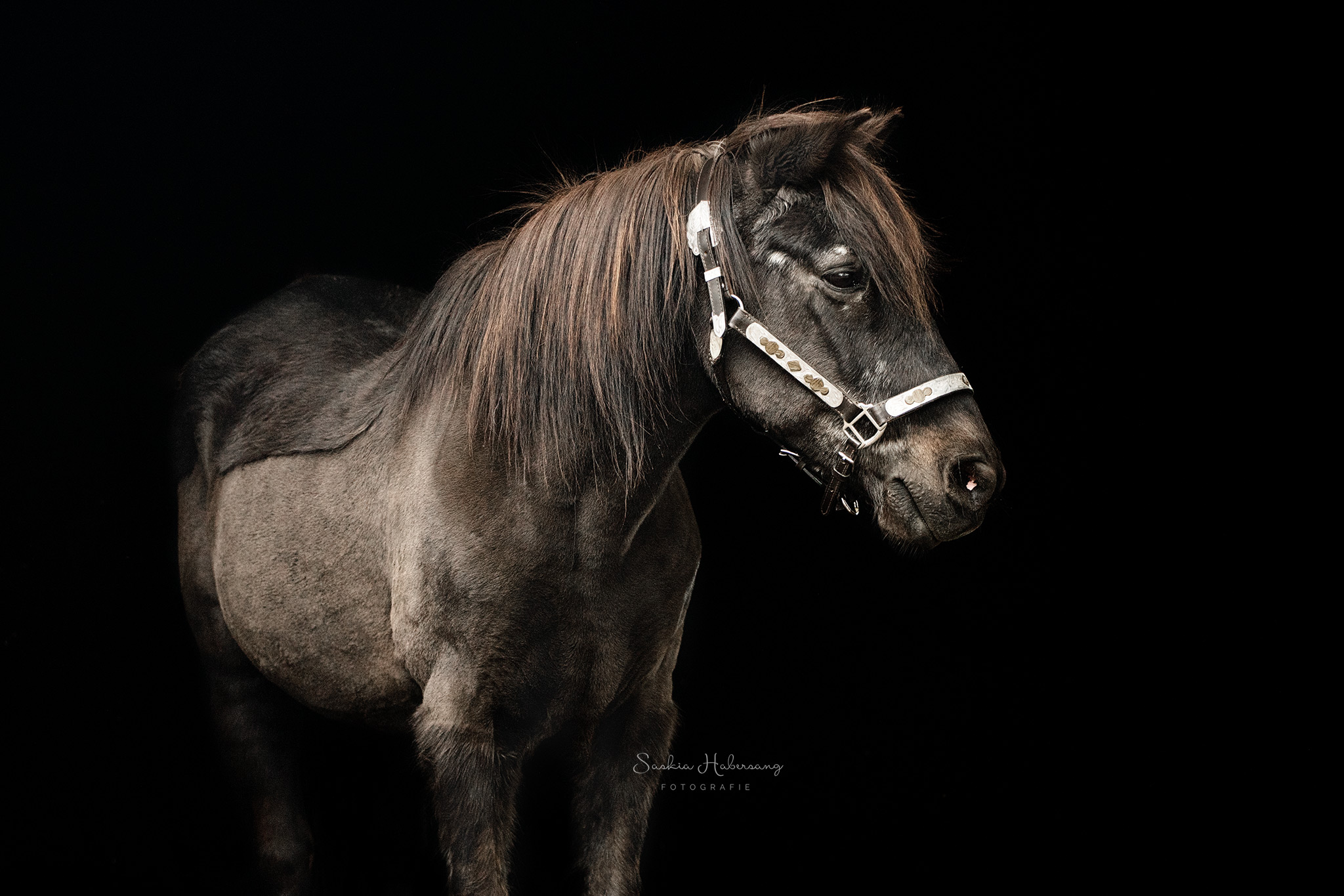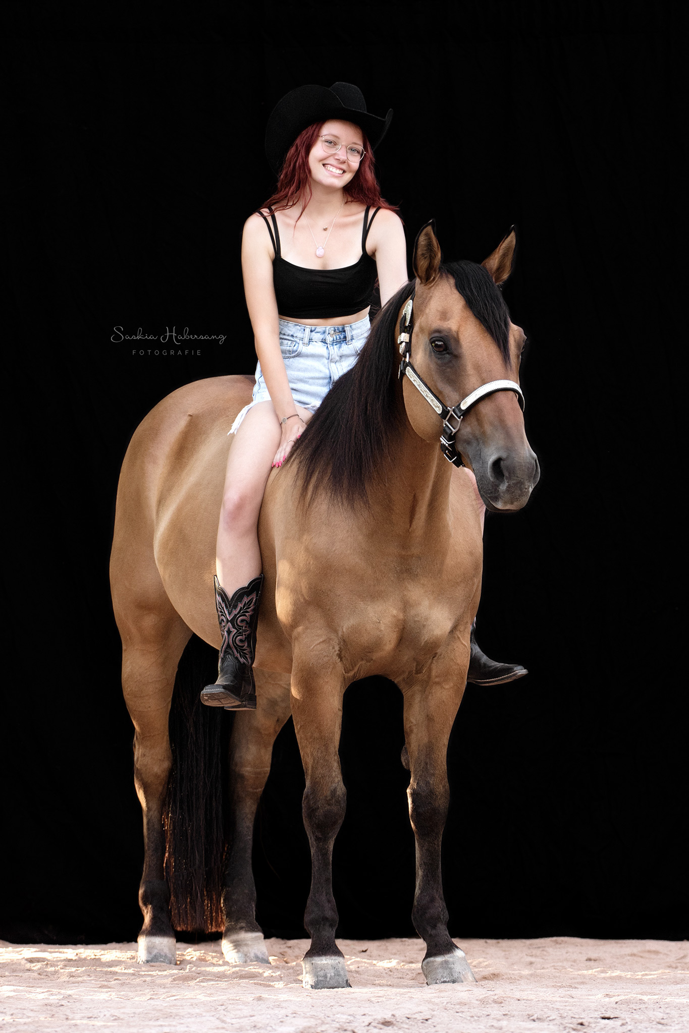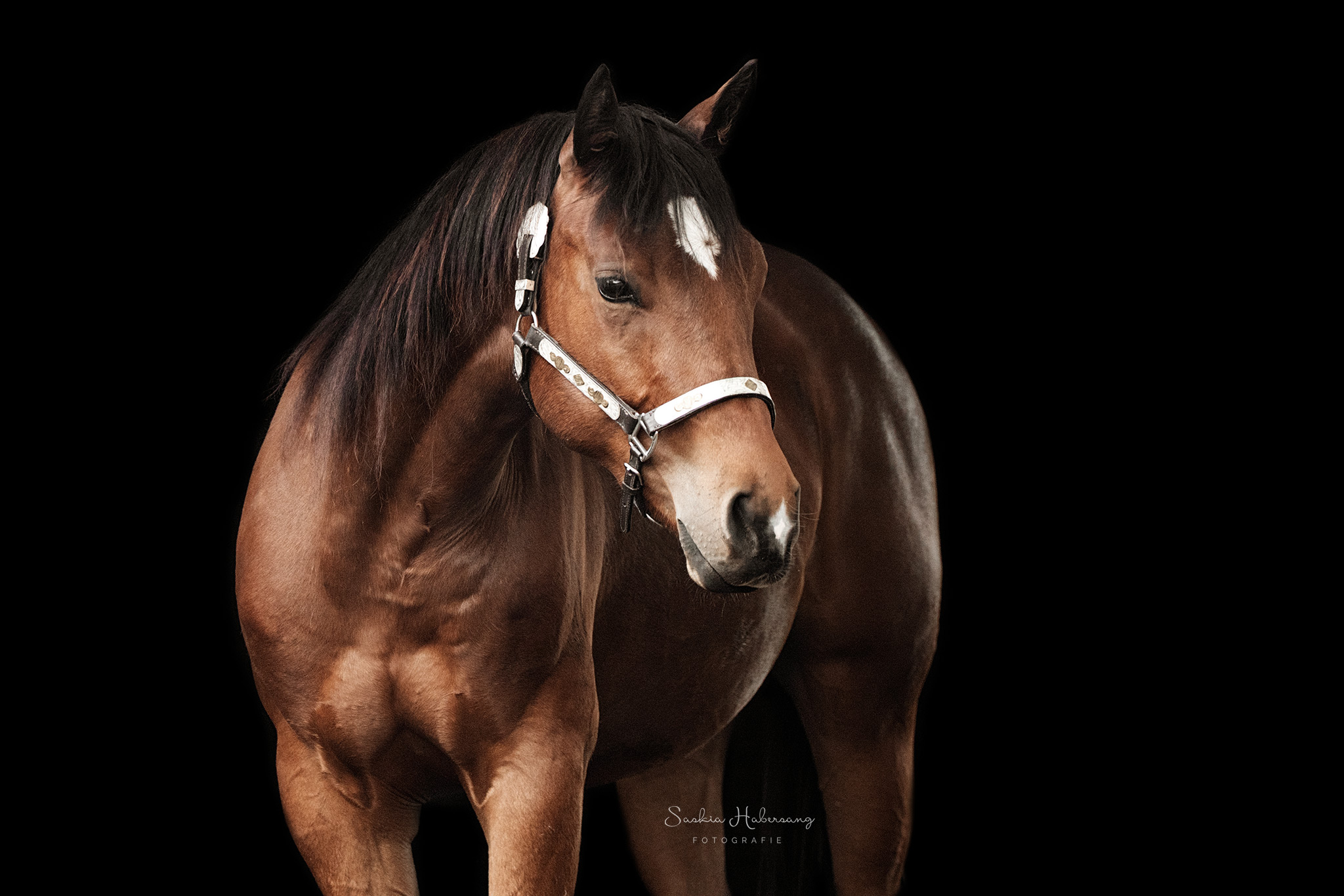 Die Pferde aus dem Stall von Westerntraining Maren Habich durften für ein Fotoshooting vor schwarzem Hintergrund posieren. Auch die beiden Reitbeteiligungen Nina und Viviana haben es sich nicht nehmen lassen und sich mit ihren Lieblingsreitschulpferden vor die Kamera getraut. Entstanden sind zeitlose, klassische Portraits.